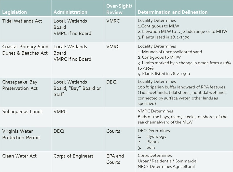 Each applicable regulatory agency conducts an independent review and issues a permit for their jurisdiction. The table shows which agencies have permit authority for tidal shorelines in Virginia. See Conduct a Hearing for a description of the permit review and approval process.