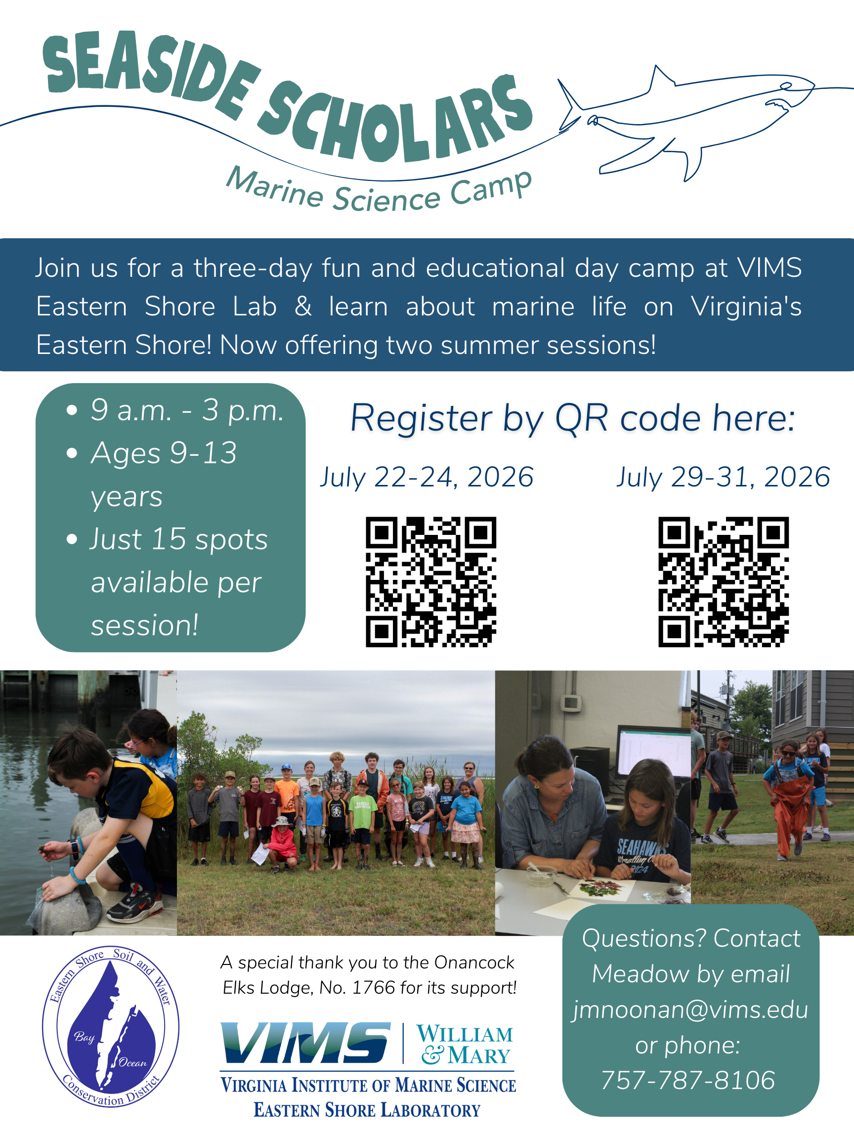 For 2026 dates or more information about camp, see the most recent attached flyer! For additional information, call 757-787-8106 or email jmnoonan@vims.edu.