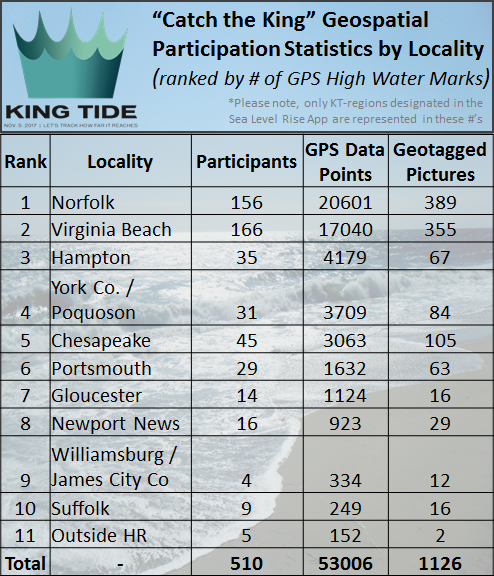Response from the event's dedicated volunteers, fueled by the local media partners' coverage leading up to the event, and over 35 separate volunteer training events held all over Hampton Roads resulted in 510 known participants collecting 53,006 time-stamped GPS maximum flooding extent measurements and 1,126 geotagged photographs of the King Tide flooding during the event.