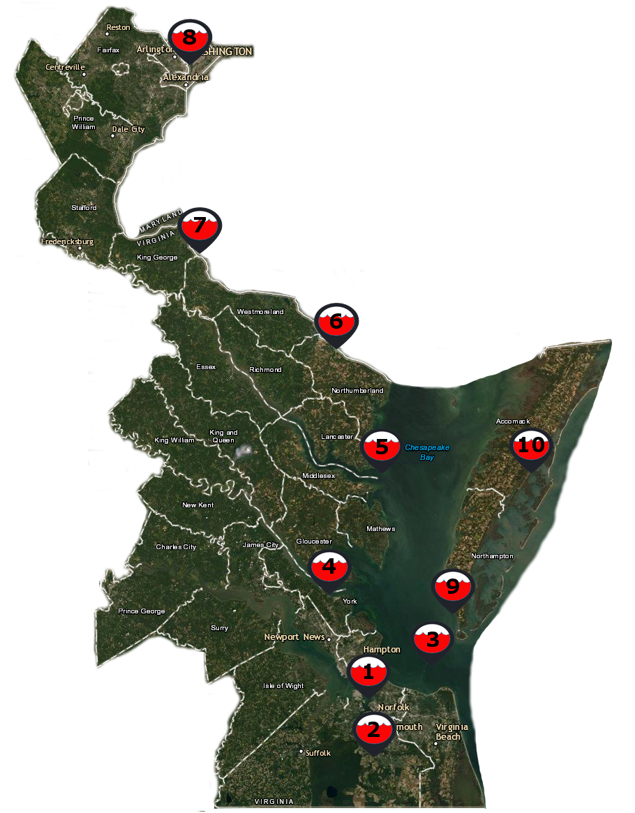 Click on one of the Tide Station Links below to access one of the National Oceanic and Atmospheric Administration's (NOAA) long-range interactive tide prediction charts. NOAA maintains 10 tide monitoring stations in VA. Refer to the map and click on the numbered station in the list below that is nearest to you to view the dates and times for the predicted tidal peaks for your area: