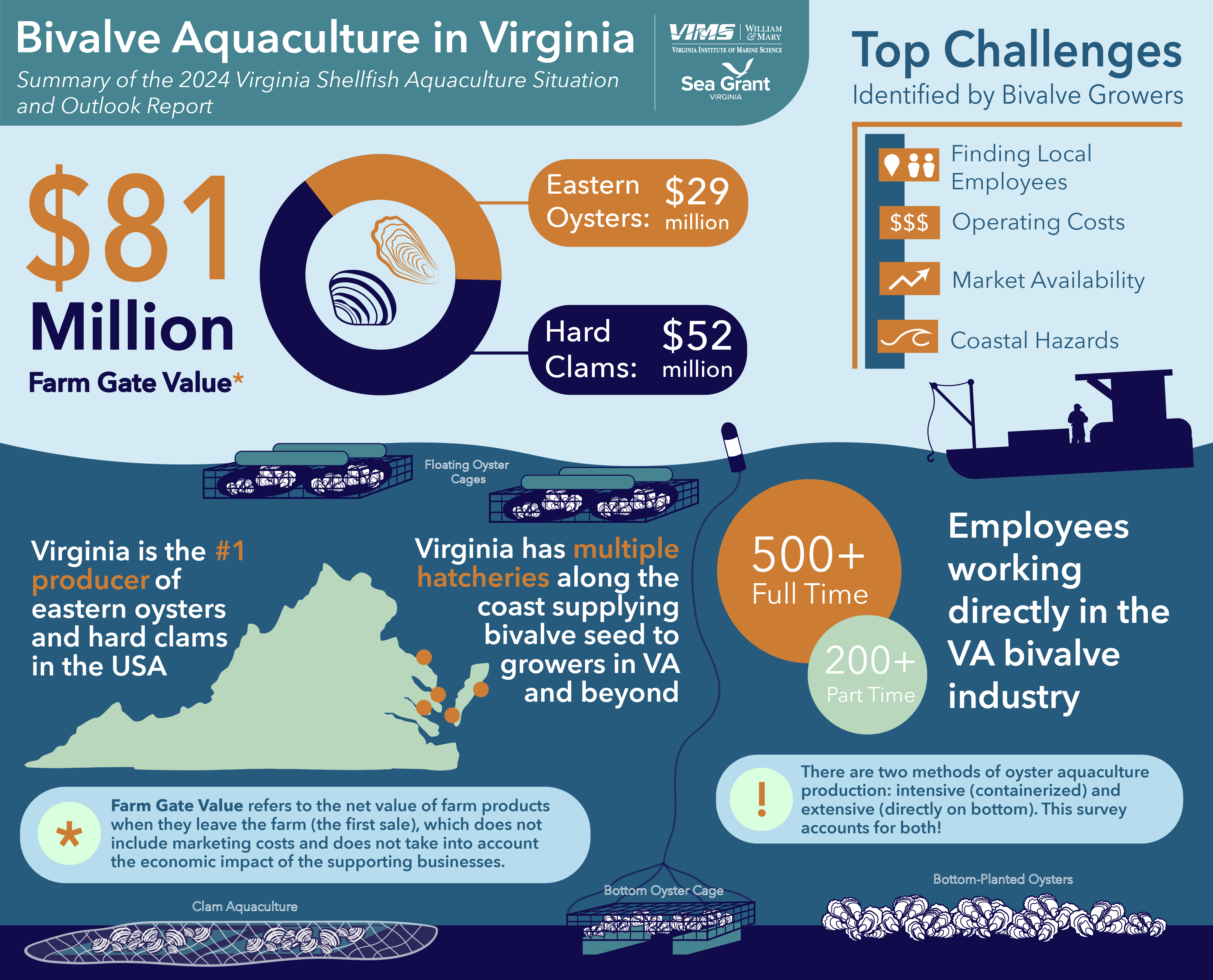 The Virginia Shellfish Aquaculture Situation and Outlook report, produced by the Marine Advisory Program (MAP), has been providing a yearly snapshot of the industry since 2004. It was paused temporarily in the wake of the COVID-19 pandemic.