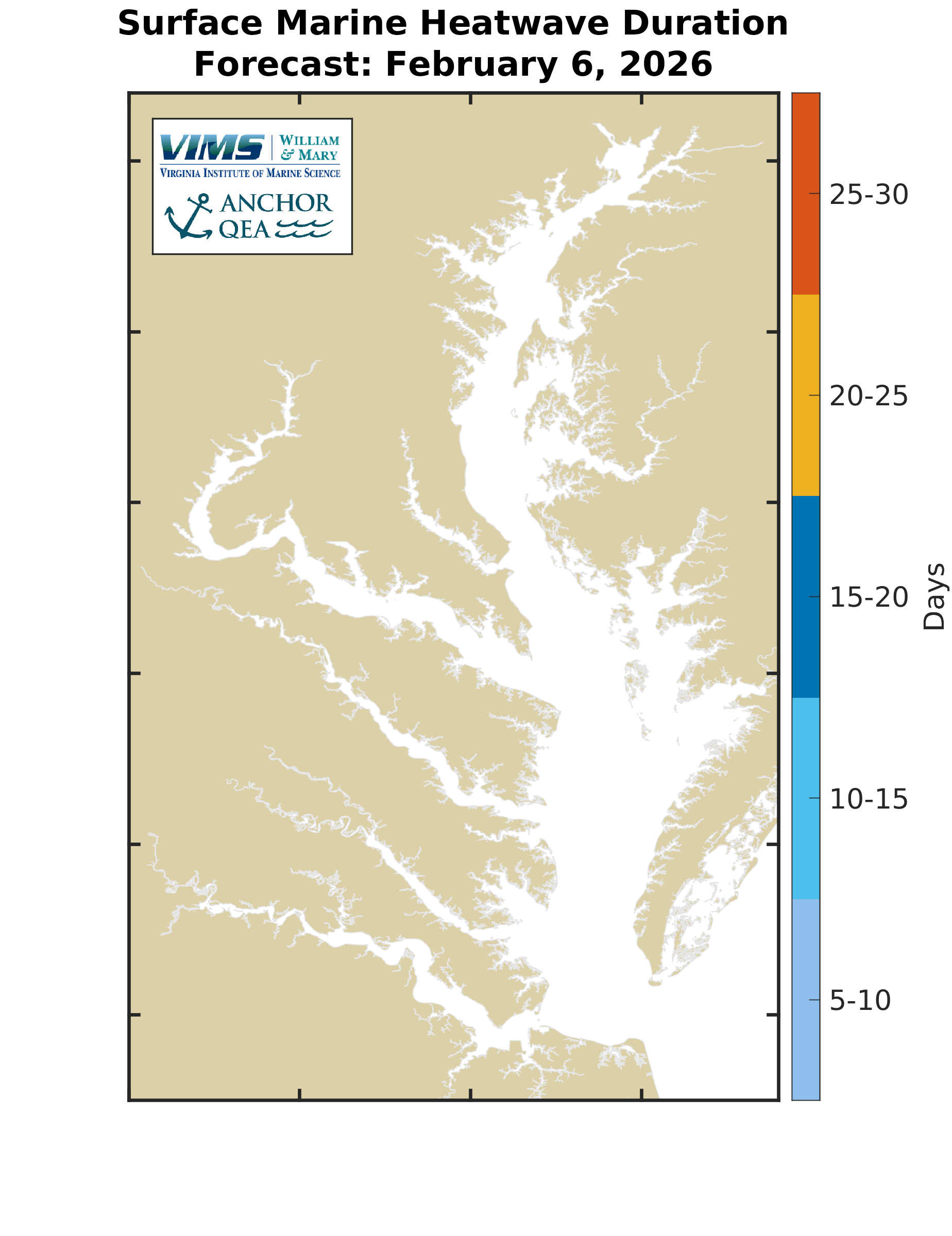 This section provides the forecast of water temperature being higher than 82.5 degrees Fahrenheit. Maps show current locations of forecast high temperatures (if any) and a line plot shows the forecast area of the Bay through time. Please note high temperature forecasting began in March 2025, so forecast areas are not available prior to that.