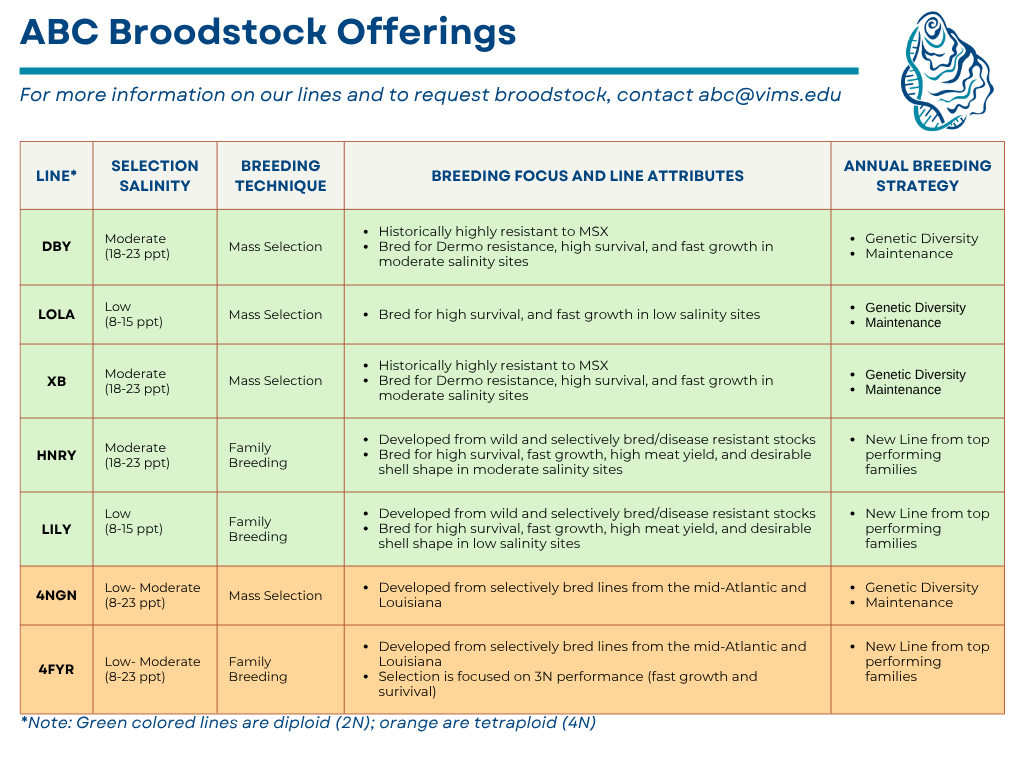 From the start of ABC in 1998, the culmination of efforts has been the release of broodstock to hatcheries for propagation of seed and eyed larvae. Progress is continuous in a breeding program; therefore, each year ABC expects to release lines that are better than the previous generation. The number of broodstock released climbed from 100 in 2004 to over 28,000 in 2018.