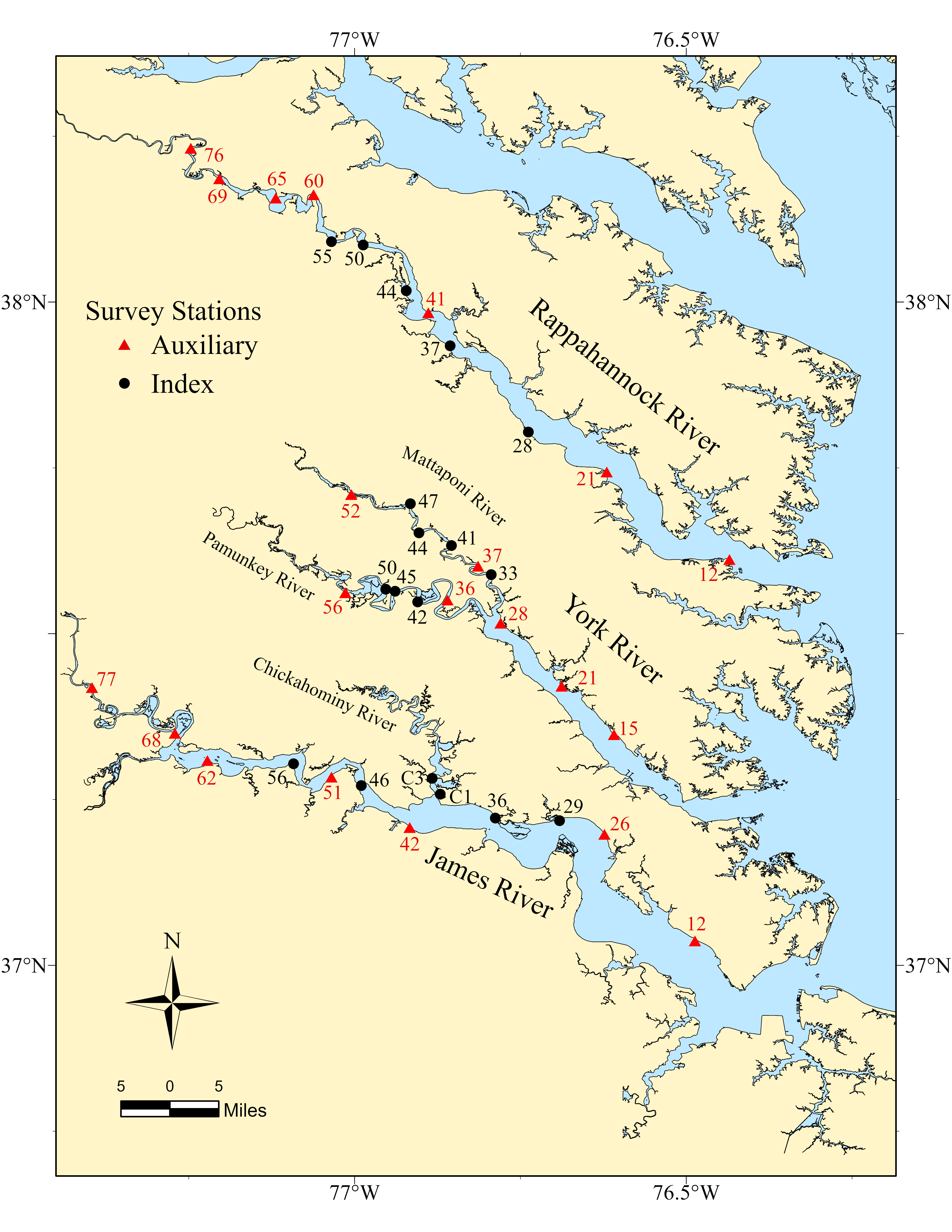 Currently, the survey samples waters from 18 historically sampled sites (index stations) and 22 auxiliary stations along the shores of the James, Chickahominy, Appomattox, York, Pamunkey, Mattaponi, and Rappahannock rivers. The addition of the auxiliary sites was made to provide better geographic coverage and, once a sufficient time series of data is developed, to create larger sample sizes within river systems so that trends in juvenile abundance can be meaningfully monitored on a system-by-system basis.